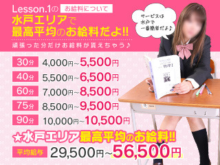 JR常磐線の偕楽園駅から徒歩16分のところにある「レッスン.1水戸校」は、水戸でナンバーワン級のソフトサービスだから未経験でも簡単に始めることができます。在籍している8割の女の子が未経験からスタートしています。そのためスタッフの未経験の女の子に対するサポート体制も抜群!学園系のお店なのでかわいい制服を着て、コスプレを楽しみながらお仕事することができちゃいます。初めてのことって誰でも不安に思うことが多いと思います。面接に来たから、1日体験をしたからといってお店で働くことを強要することはありません。体験してみてダメだと思ったらやめても大丈夫です。些細なことでも気になることがあればスタッフに聞いてみると安心できると思います。